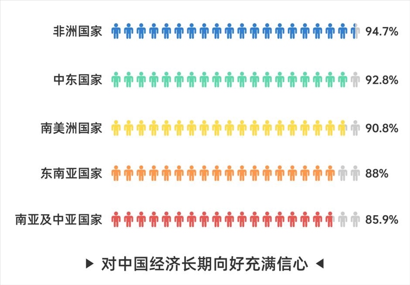 此外,81.3%的受訪者對(duì)于中國(guó)經(jīng)濟(jì)長(zhǎng)期向好充滿(mǎn)信心,較去年上升7.1個(gè)百分點(diǎn),認(rèn)同度排在前五位的分別是非洲國(guó)家受訪者(94.7%)、中東國(guó)家受訪者(92.8%)、南美洲國(guó)家受訪者(90.8%)、東南亞國(guó)家受訪者(88%)和南亞及中亞國(guó)家受訪者(85.9%)。