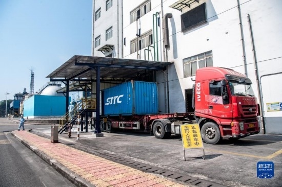 10月17日,在中國石化集團重慶川維化工有限公司,工作人員在將以乙炔為原料生產(chǎn)的化工產(chǎn)品進行打包裝車。