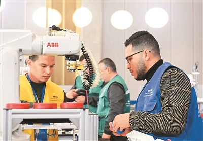 2024年12月18日,第三屆上合組織國家職工技能大賽在青島市開幕。圖為來自埃及的易卜拉欣·穆西·赫爾米·穆西(前右)與穆斯塔法·霍斯尼·穆斯塔法·梅特瓦利(前左)在工業(yè)機(jī)器人操作調(diào)整工項(xiàng)目比賽中。