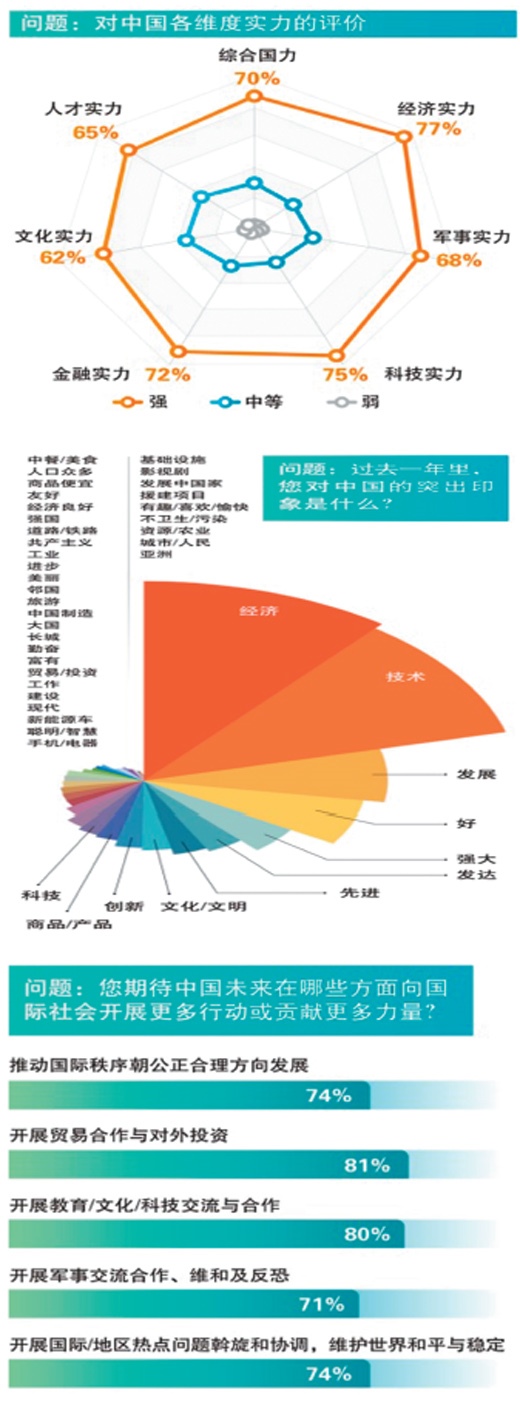 調(diào)查問(wèn)卷讓被訪者自主描繪其過(guò)去一年里對(duì)中國(guó)的突出印象。報(bào)告顯示,各國(guó)民眾使用率最高的關(guān)鍵詞包括“經(jīng)濟(jì)”“技術(shù)/科技”“發(fā)展/發(fā)達(dá)”“好”“強(qiáng)大/強(qiáng)國(guó)”“先進(jìn)/創(chuàng)新”“文化/文明”“商品/產(chǎn)品”“人口眾多”“中餐/美食”等。在發(fā)達(dá)國(guó)家、歐洲國(guó)家、中東國(guó)家和東盟國(guó)家,“經(jīng)濟(jì)”被提及的頻次居首;在發(fā)展中國(guó)家、非洲國(guó)家、金磚國(guó)家,“技術(shù)”被提及的頻次最高。