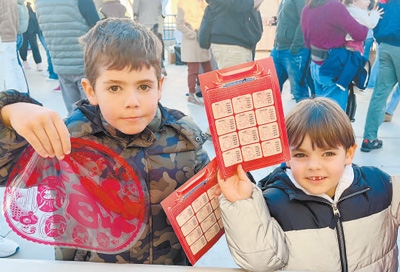 1月19日,在西班牙阿利坎特2025蛇年春節(jié)廟會(huì)上,小朋友們收集中國生肖印章并兌換新春福字窗花。