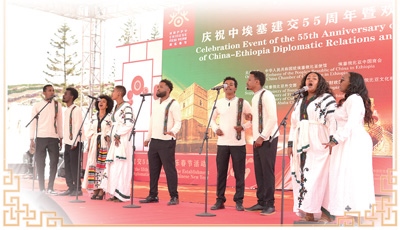 在近日舉辦的“慶祝中埃塞建交55周年暨歡樂春節(jié)活動(dòng)”上,當(dāng)?shù)孛癖姾铣H肀葋唫鹘y(tǒng)歌曲。