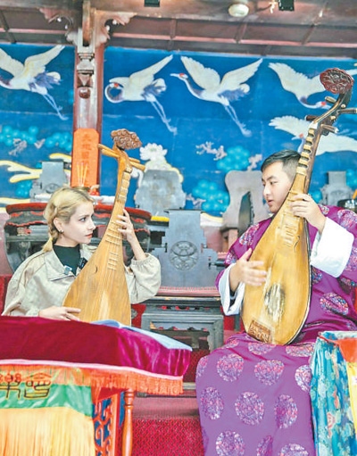 在一家漢服店,兩人興致勃勃地換上漢服,特意選擇了紅色,“感覺一下子就融入了古鎮(zhèn)氛圍”。在公共閱讀空間“鐘書房”,他們在老師的指導(dǎo)下,在紅紙上揮毫潑墨,學(xué)寫“福”字。喜歡爵士樂的他們隨身攜帶電吉他,看到有老師傅正在演奏二胡,便來到一旁即興合奏起來,中西方音樂的交融,吸引許多游客駐足喝彩。“親眼來看看中國,遠比電視上看到的更美,以后還要帶著朋友再來。”他們的臉上透著興奮。