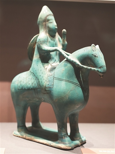 綠松石色釉小型樂隊模型為公元12—13世紀的作品,其結(jié)構(gòu)呈方形,表現(xiàn)了樂隊演奏或宴會場景,11名樂手分別演奏鐃鈸、鼓、琴、長笛等樂器,場地中央置一果盤。藍釉黑彩騎士陶塑刻畫了具有東亞特征面孔的騎士形象。騎士頭戴尖頂帽,背負盾牌,其造型受到中國藝術(shù)的影響。