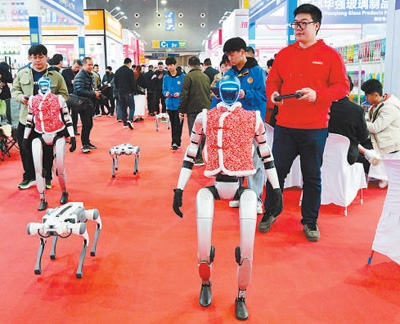 2025年3月14日,在2025中國義烏國際日用百貨創(chuàng)新博覽會上,智能機器人與現(xiàn)場人員互動。
