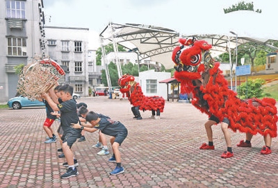 馬來西亞中小學(xué)生在馬來亞大學(xué)醒獅團(tuán)組織的培訓(xùn)課上練習(xí)舞獅。
