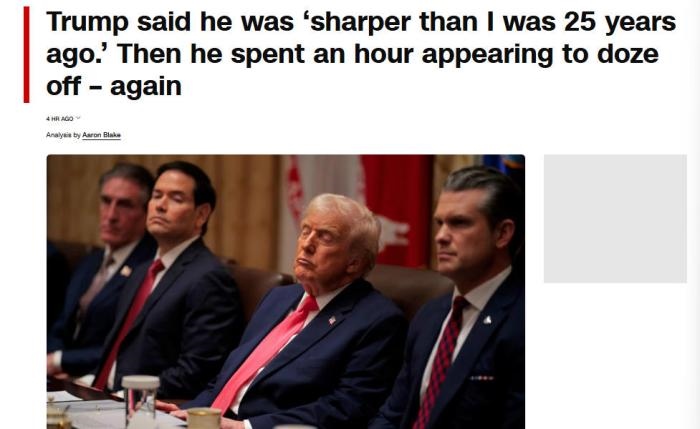 美國(guó)有線電視新聞網(wǎng)(CNN)注意到,當(dāng)美國(guó)商務(wù)部長(zhǎng)盧特尼克談及貿(mào)易戰(zhàn)時(shí),特朗普“似乎難以睜開眼睛”。在美國(guó)教育部長(zhǎng)麥克馬洪和美國(guó)衛(wèi)生與公眾服務(wù)部長(zhǎng)小羅伯特·肯尼迪發(fā)言時(shí),特朗普“似乎僵住了,閉著眼睛,每次持續(xù)10到15秒,然后才轉(zhuǎn)動(dòng)眼球或點(diǎn)頭”。