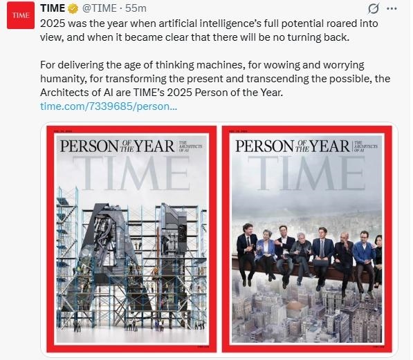 《時代》周刊在社交媒體上稱,2025年是人工智能潛力全面爆發(fā)且無可回頭的一年。