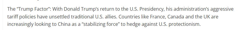 文章說,美國政府的強(qiáng)硬關(guān)稅政策令美國傳統(tǒng)盟友感到不安。法國、加拿大和英國等國家正日益將中國視為“穩(wěn)定力量”,以對(duì)沖美國保護(hù)主義帶來的風(fēng)險(xiǎn)。