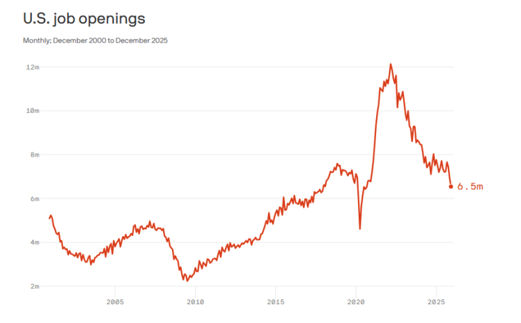 美國《國會山報(bào)》援引美國勞工統(tǒng)計(jì)局的數(shù)據(jù)報(bào)道稱,美國2025年12月份的職位空缺數(shù)量為650萬個,呈下降趨勢,較上年同期減少了96.6萬個。