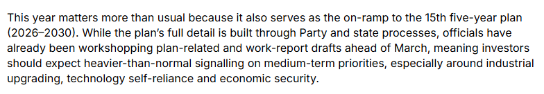 文章說,今年的兩會尤為關(guān)鍵,將為第十五個(gè)五年規(guī)劃(2026-2030年)奠定基礎(chǔ)。投資者應(yīng)關(guān)注比往年更明確的政策信號,特別是在產(chǎn)業(yè)升級、科技自主和經(jīng)濟(jì)安全等領(lǐng)域。