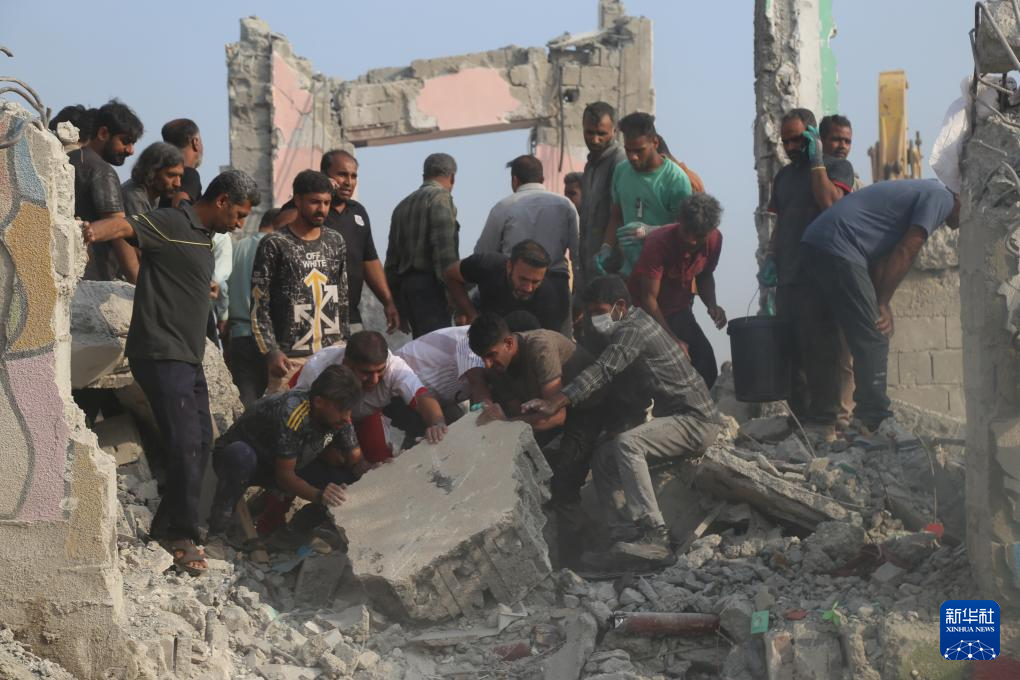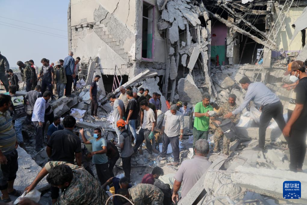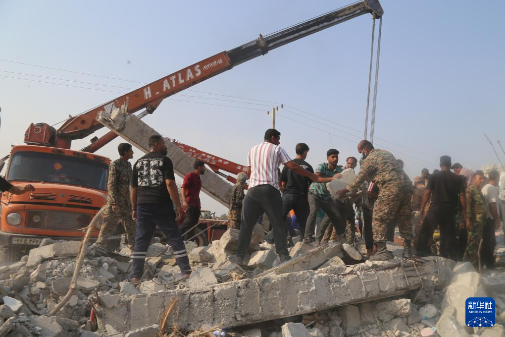 2月28日,在伊朗米納卜市一所被襲擊的小學(xué),救援人員和當(dāng)?shù)鼐用裨噲D從廢墟里營救傷員。