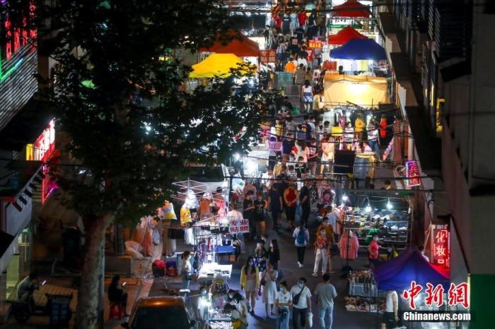 資料圖:6月3日,市民在武漢保成路夜市消費(fèi)休閑。隨著復(fù)工復(fù)產(chǎn)復(fù)市持續(xù)推進(jìn),武漢傳統(tǒng)的街頭夜市熱鬧起來,不少市民前來消費(fèi)休閑。 中新社記者 張暢 攝