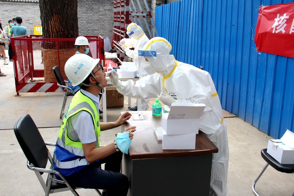 6月15日至17日,中建三局北京公司在京1042名職工做完核酸檢測,同時(shí)公司邀請專業(yè)機(jī)構(gòu)為在建項(xiàng)目的上萬名勞務(wù)工人、安保及物業(yè)管理人員提供上門核酸檢測。新華社發(fā)(柯玉乾攝)