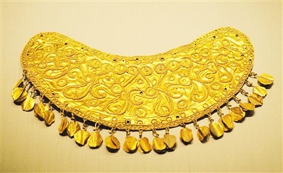 展廳里有不少光彩照人的漢代金飾品,體現(xiàn)了多元文明的融匯。一套出土于鄂爾多斯的金鑲貝玉首飾,由長(zhǎng)方形鹿紋金飾牌、方形嵌蚌金串飾、包金玉佩等組成,其中的鹿紋是典型的草原風(fēng)格紋飾,嵌蚌及其周圍的連珠紋工藝則具有波斯等西方文明的工藝特征。一塊出土于通遼的金飾牌,是薩滿主持祭祀活動(dòng)時(shí)佩戴的飾件,中間雕有一高鼻深目、頭戴尖頂帽的女性,兩側(cè)各有一只怪獸,與西伯利亞地區(qū)出土的雙獅守護(hù)圣樹(shù)金飾牌極為相似。