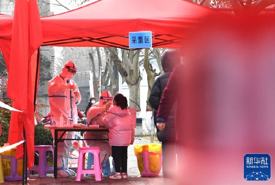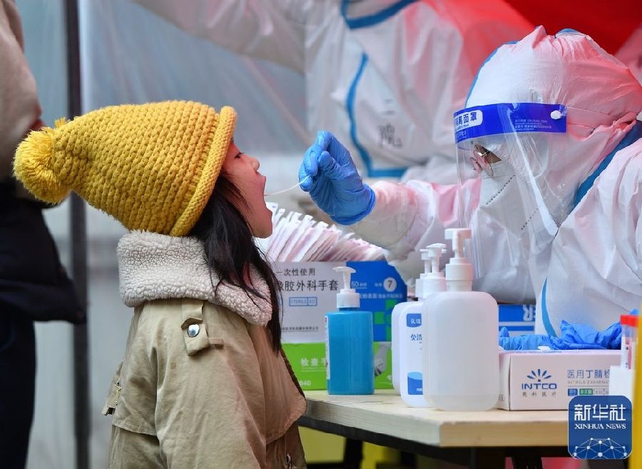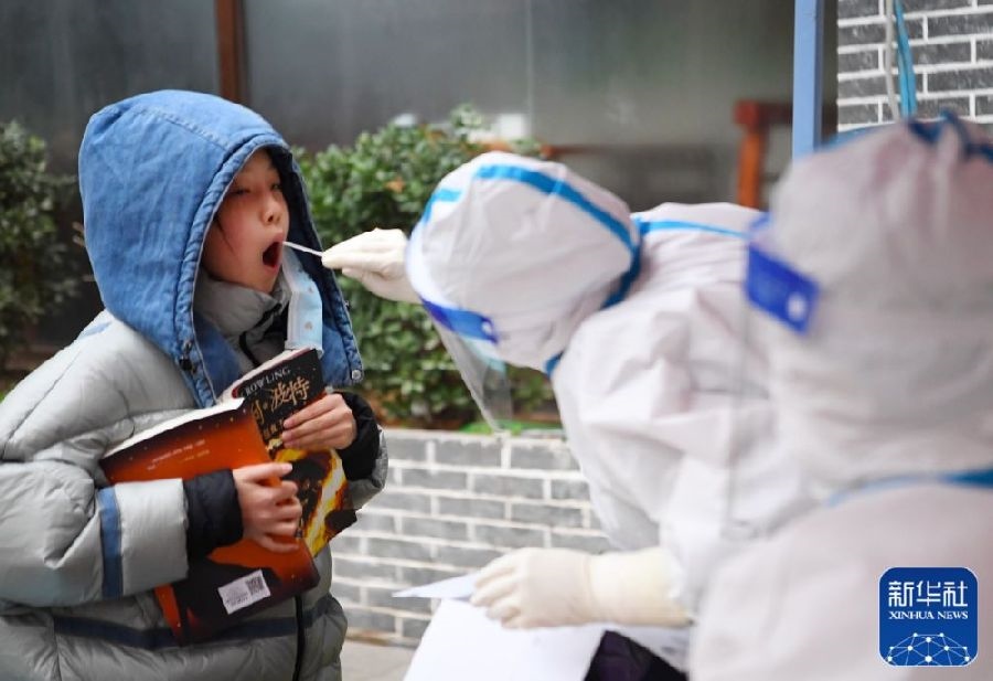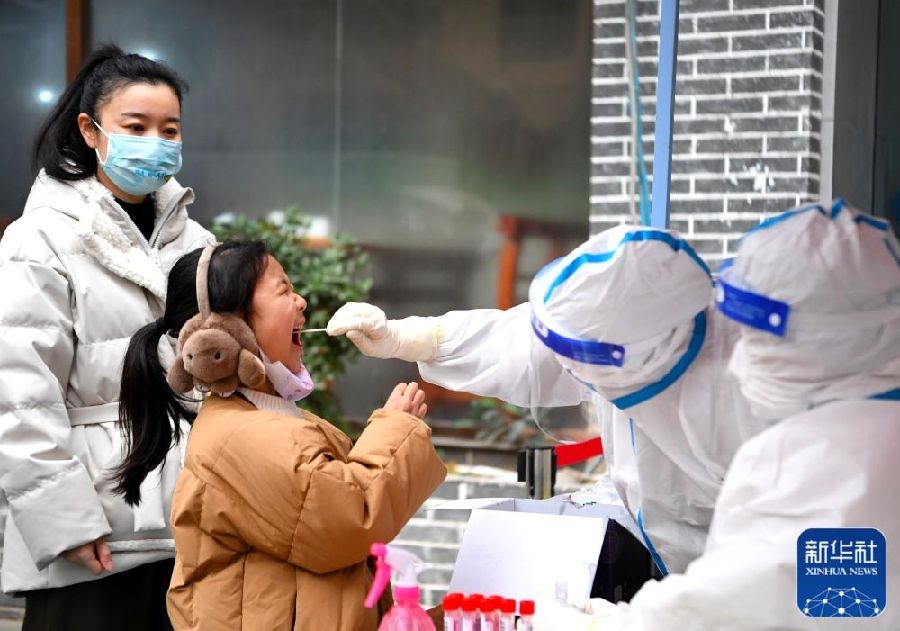 1月10日,在鄭州市二七區(qū)政通路一處核酸檢測點,醫(yī)務(wù)人員為小朋友進(jìn)行核酸檢測取樣。新華社發(fā)(丁友明攝)