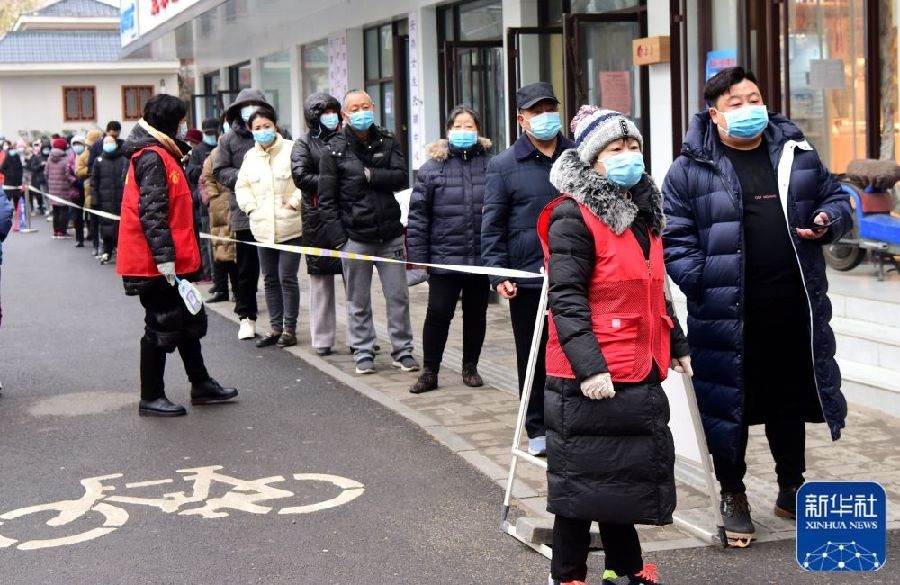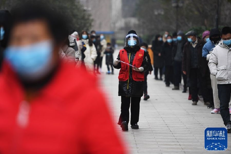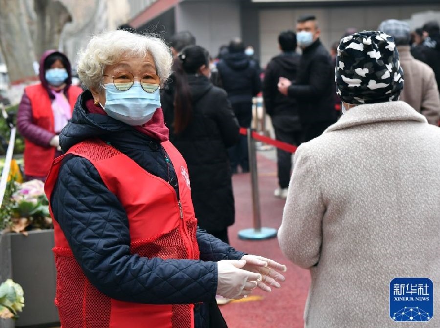 1月7日,在鄭州市經(jīng)八路辦事處一處檢測點,75歲的志愿者耿小娣(左)在引導(dǎo)市民排隊。新華社記者李嘉南攝