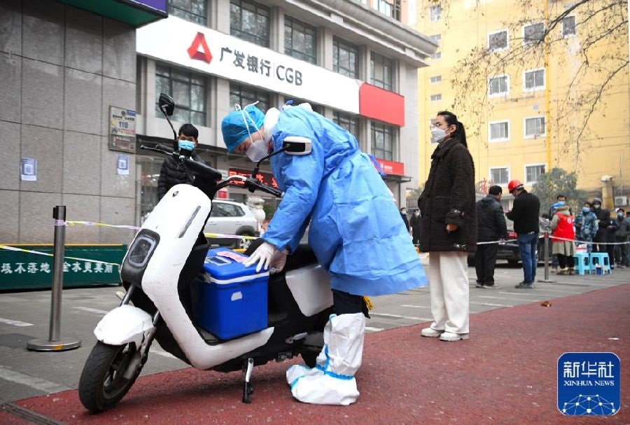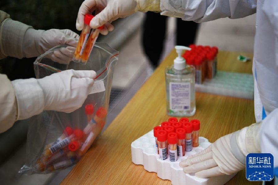 1月10日,在鄭州市緯一路核酸檢測點,醫(yī)護(hù)人員在封裝核酸樣本箱,準(zhǔn)備送檢。新華社記者郝源攝