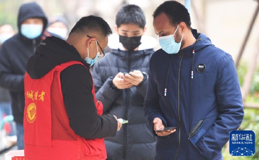 1月10日,在鄭州市高新區(qū)楓楊辦事處譽(yù)園核酸檢測點,志愿者幫助外籍人員掃碼登記。新華社記者張浩然攝