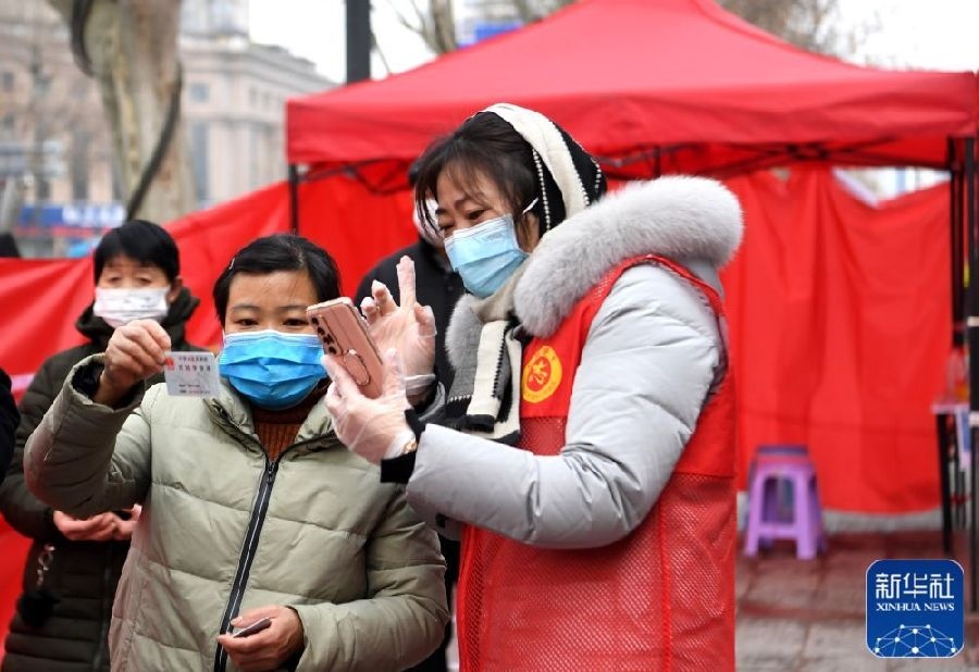 1月8日,在鄭州市金水區(qū)花園路街道辦事處一社區(qū)核酸檢測點,志愿者在協(xié)助市民掃碼登記。新華社記者郝源攝