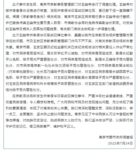 此次玄奘寺供奉侵華日軍戰(zhàn)犯牌位事件,暴露出我市在宗教活動(dòng)場所管理等方面存在的問題,市及玄武區(qū)宗教事務(wù)管理部門作風(fēng)不嚴(yán)不實(shí),對有關(guān)宗教活動(dòng)場所失管失察。南京市委、玄武區(qū)委及紀(jì)檢監(jiān)察機(jī)關(guān)已依紀(jì)依規(guī)依法對相關(guān)責(zé)任人作出嚴(yán)肅處理:對市民宗局黨組書記、局長蘇宇紅予以誡勉,對市民宗局黨組成員、副局長紀(jì)勤予以免職、給予黨內(nèi)嚴(yán)重警告處分,對市民宗局黨組成員、副局長王鍵給予黨內(nèi)警告處分,對市民宗局宗教一處處長張文波給予黨內(nèi)警告處分,對市民宗局政策法規(guī)處(行政審批服務(wù)處)處長后乃娟給予黨內(nèi)警告處分,對玄武區(qū)民宗局局長胡圓圓予以免職、給予黨內(nèi)嚴(yán)重警告處分,對玄武區(qū)民宗局副局長周勇給予黨內(nèi)嚴(yán)重警告處分,對玄武區(qū)民宗局民宗科科長楊菁給予政務(wù)警告處分,對玄武區(qū)玄武門街道統(tǒng)戰(zhàn)委員桂旭光給予黨內(nèi)警告處分。