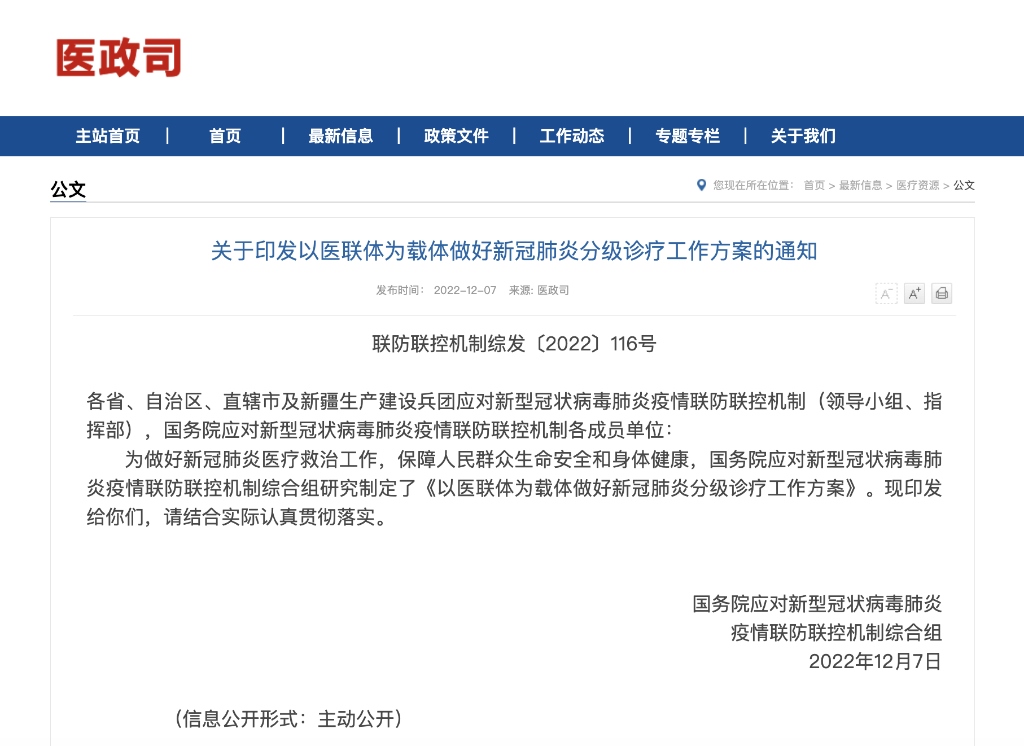 新華社北京12月7日電 為做好新冠肺炎醫(yī)療救治工作,全力保障高齡合并基礎(chǔ)疾病等重癥風險較高的感染者及時救治,構(gòu)建更加科學有序的就醫(yī)秩序,國務(wù)院聯(lián)防聯(lián)控機制綜合組12月7日發(fā)布《以醫(yī)聯(lián)體為載體做好新冠肺炎分級診療工作方案》。