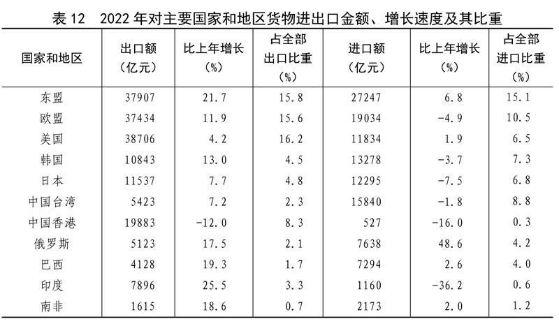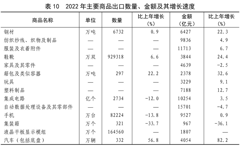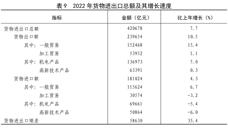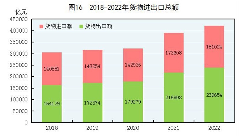 全年貨物進(jìn)出口總額420678億元,比上年增長7.7%。其中,出口239654億元,增長10.5%;進(jìn)口181024億元,增長4.3%。貨物進(jìn)出口順差58630億元,比上年增加15330億元。對(duì)“一帶一路”[40]沿線國家進(jìn)出口總額138339億元,比上年增長19.4%。其中,出口78877億元,增長20.0%;進(jìn)口59461億元,增長18.7%。對(duì)《區(qū)域全面經(jīng)濟(jì)伙伴關(guān)系協(xié)定》(RCEP)其他成員國[41]進(jìn)出口額129499億元,比上年增長7.5%。