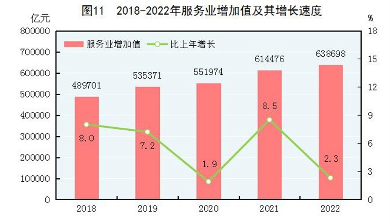 全年批發(fā)和零售業(yè)增加值114518億元,比上年增長0.9%;交通運(yùn)輸、倉儲(chǔ)和郵政業(yè)增加值49674億元,下降0.8%;住宿和餐飲業(yè)增加值17855億元,下降2.3%;金融業(yè)增加值96811億元,增長5.6%;房地產(chǎn)業(yè)增加值73821億元,下降5.1%;信息傳輸、軟件和信息技術(shù)服務(wù)業(yè)增加值47934億元,增長9.1%;租賃和商務(wù)服務(wù)業(yè)增加值39153億元,增長3.4%。全年規(guī)模以上服務(wù)業(yè)企業(yè)營業(yè)收入比上年增長2.7%,利潤總額增長8.5%。