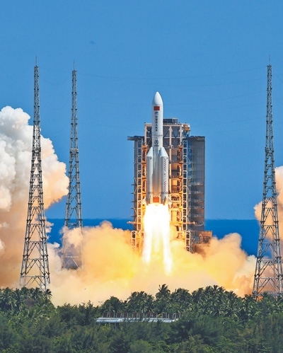 搭載問(wèn)天實(shí)驗(yàn)艙的長(zhǎng)征五號(hào)B遙三運(yùn)載火箭,在海南文昌航天發(fā)射場(chǎng)點(diǎn)火發(fā)射。 新華社記者 李 剛攝