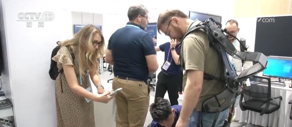 在新設(shè)的工業(yè)自動(dòng)化及智能制造新展區(qū),一位在剛果(金)經(jīng)營(yíng)礦場(chǎng)的采購(gòu)商正在試穿一款外骨骼產(chǎn)品,這款智能設(shè)備可以幫助實(shí)現(xiàn)減輕30%到70%的負(fù)重。