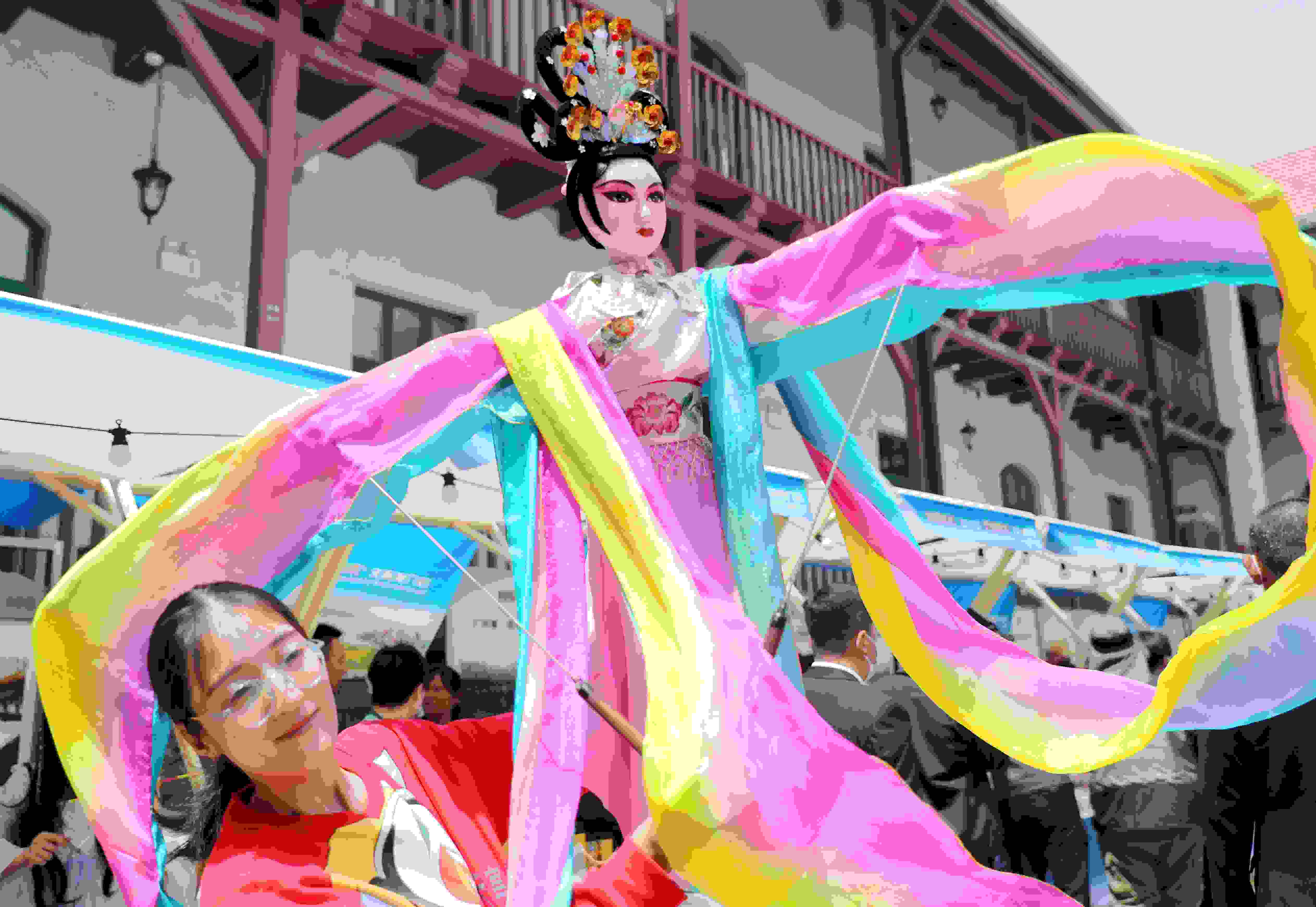 4月30日,山東萊西木偶藝術團的演員在給游人們展示木偶戲的表演技巧。 張進剛 攝