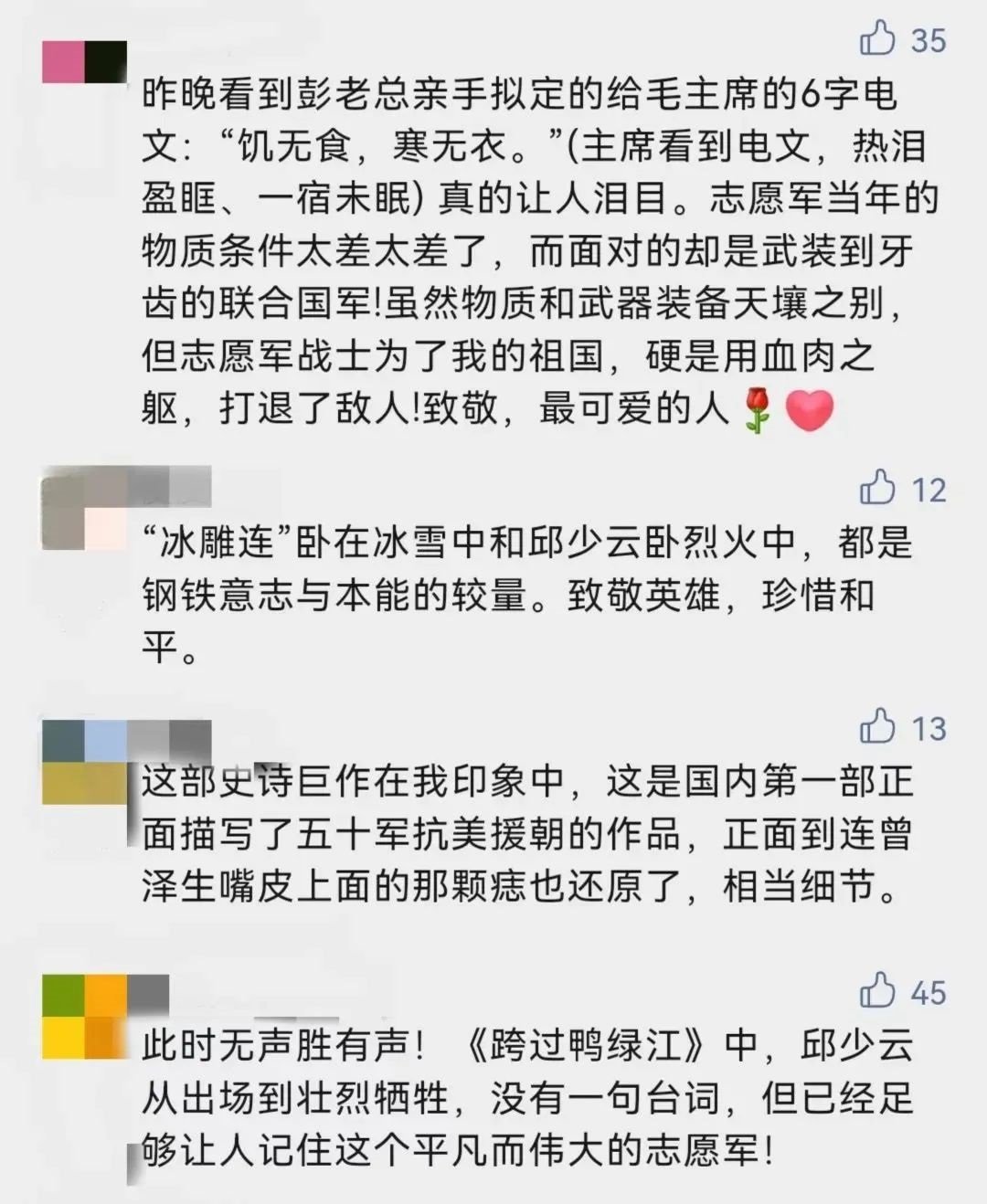 “抗美援朝絕對(duì)是值得紀(jì)念和謳歌的奇跡!這部電視劇是一部愛(ài)國(guó)主義教育的活教材!”這是網(wǎng)友對(duì)這部劇的評(píng)價(jià)。