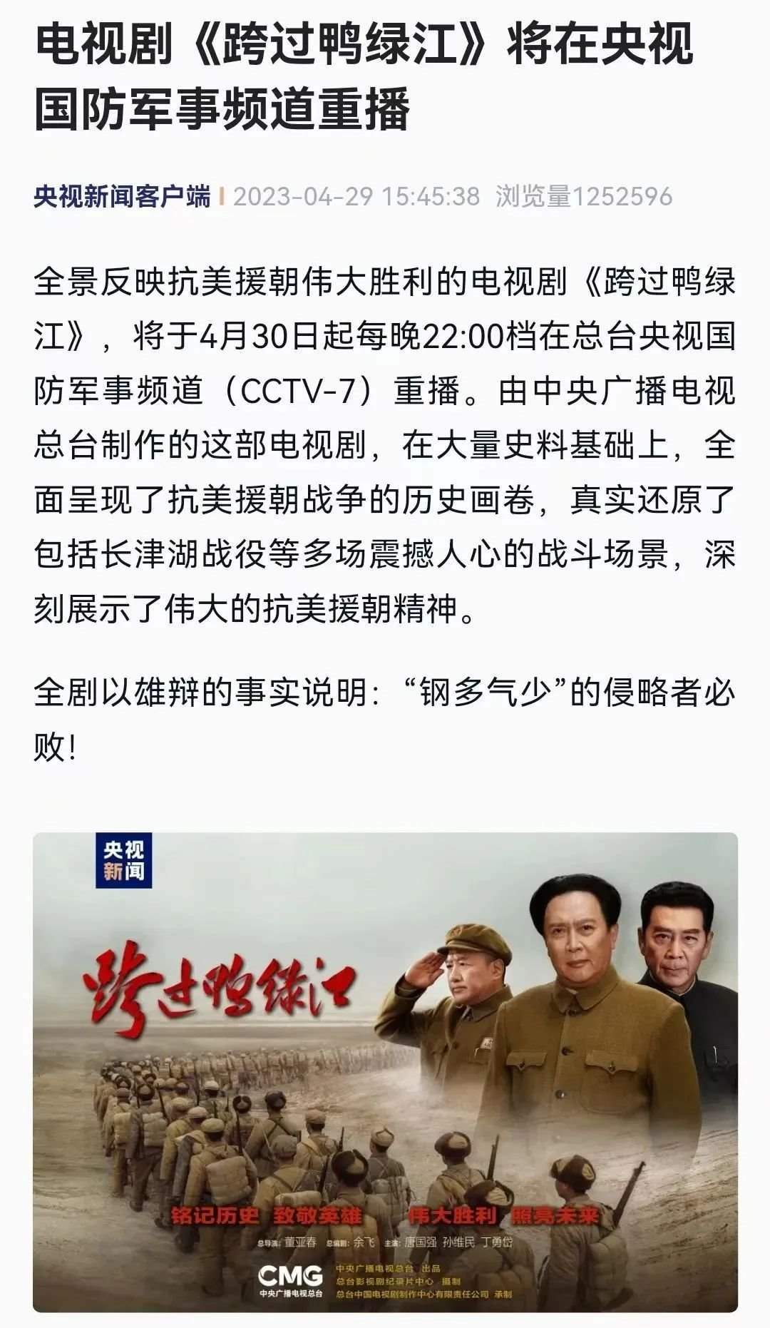 4月29日,中央廣播電視總臺(tái)發(fā)布預(yù)告:電視劇《跨過(guò)鴨綠江》自4月30日起每晚22點(diǎn)檔在央視國(guó)防軍事頻道重播。