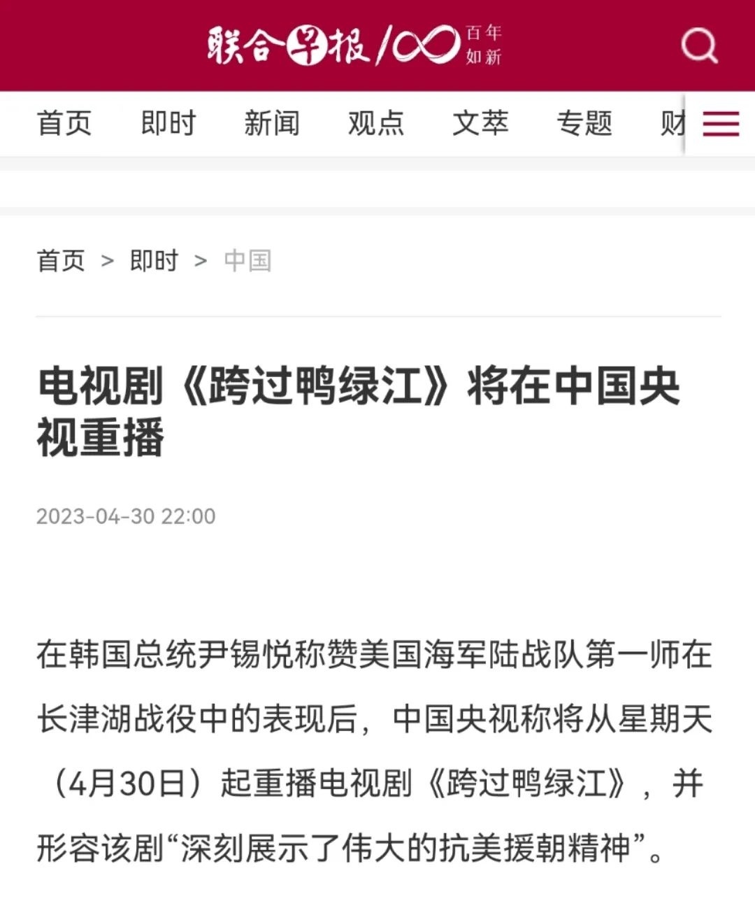 新加坡《聯(lián)合早報(bào)》更在4月30日晚10點(diǎn)準(zhǔn)時(shí)發(fā)布文章《電視劇<跨過(guò)鴨綠江>將在中國(guó)央視重播》,開(kāi)篇明確重點(diǎn):在韓國(guó)總統(tǒng)稱贊美國(guó)海軍陸戰(zhàn)隊(duì)第一師在長(zhǎng)津湖戰(zhàn)役中的表現(xiàn)后,中國(guó)央視稱將從星期天(4月30日)起重播電視劇《跨過(guò)鴨綠江》。