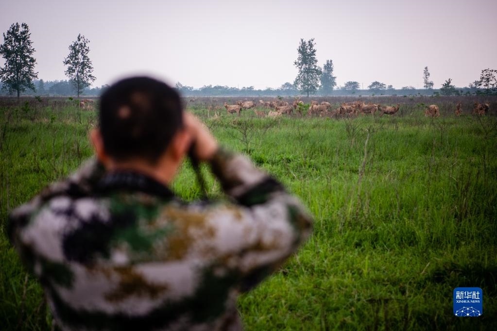 巡護隊伍通過望遠鏡、長焦相機、無人機、視頻監(jiān)測塔、紅外相機等工具,對1500余頭麋鹿進行日常監(jiān)測、年節(jié)律周期監(jiān)測、種群動態(tài)監(jiān)測,并對保護區(qū)內(nèi)的氣象數(shù)據(jù)、水文數(shù)據(jù)、地表水質(zhì)數(shù)據(jù)、植被類型以及其他野生動物情況進行監(jiān)測記錄。他們還需要承擔(dān)卡口值守、應(yīng)急管理等工作。在他們的悉心照料下,這里成為適宜麋鹿種群棲息的家園。