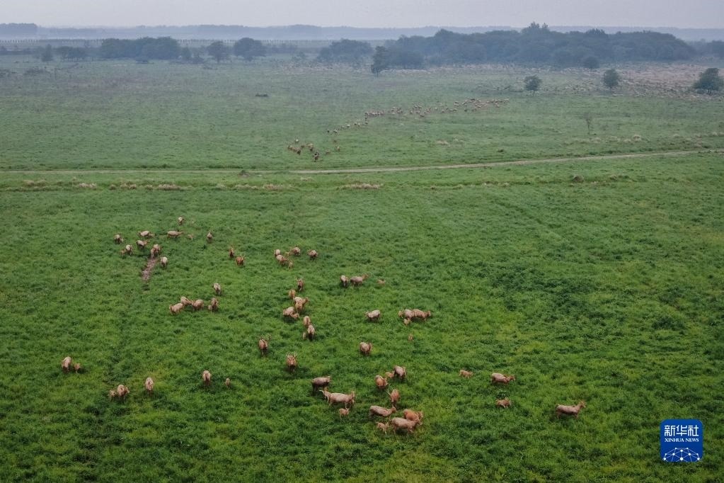 4月28日,一群麋鹿在石首麋鹿國家級自然保護區(qū)活動(無人機照片)。 新華社記者 伍志尊 攝
