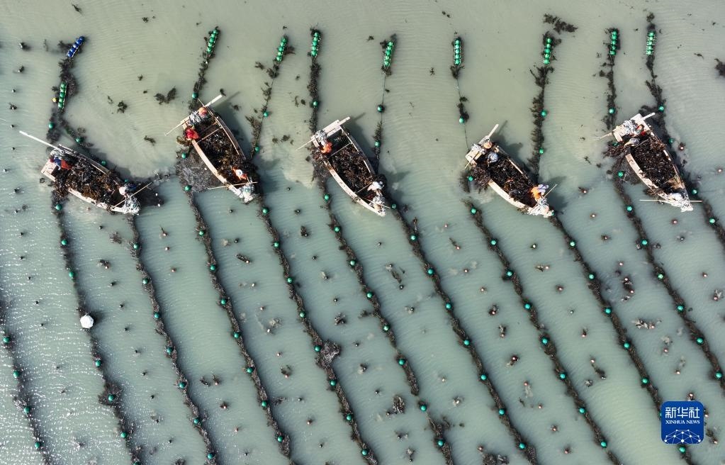 5月8日,在山東省榮成市愛倫灣海域海帶養(yǎng)殖區(qū),漁民采收海帶(無人機(jī)照片)。