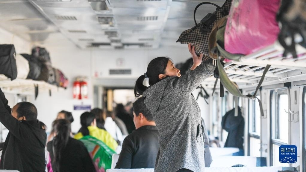 在K5151次列車車廂中,一位乘客將行李放置在行李架上(5月6日攝)。   新華社記者 王松 攝