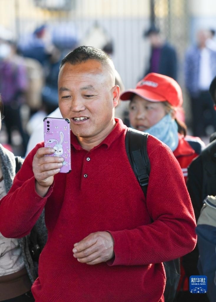 在綏化火車站站臺(tái),乘客在等候K5151次列車時(shí)與親友視頻通話(5月6日攝)。   新華社記者 王松 攝