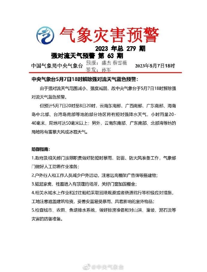 央視網(wǎng)消息:中央氣象臺(tái)5月7日18時(shí)解除暴雨藍(lán)色預(yù)警和強(qiáng)對(duì)流天氣藍(lán)色預(yù)警。