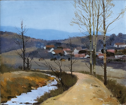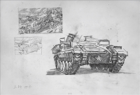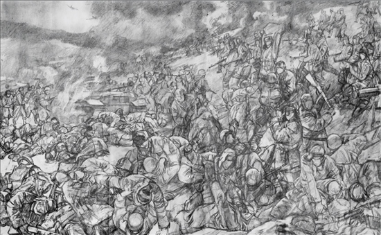 《激戰(zhàn)松骨峰》描繪的是抗美援朝戰(zhàn)爭中,中國人民志愿軍與美軍激烈廝殺的悲壯場面。作者從動態(tài)型的構(gòu)圖與形象表層,把戰(zhàn)爭集團之間的搏殺以濃重的筆調(diào)展現(xiàn)開來,表現(xiàn)了中國人民志愿軍英勇頑強、熱愛自由和勇于犧牲的精神,展示了歷史的悲劇性沖突。作者從沉甸甸的歷史中找到戰(zhàn)爭中最慘烈、最殘酷、最能表現(xiàn)人物悲劇性命運的瞬間,用現(xiàn)實主義的創(chuàng)作手法,扎實、生動地塑造了一個又一個志愿軍勇士的形象。硝煙籠罩著戰(zhàn)場,鮮血與白雪融合成冰,敵我雙方,犬牙交錯,生死搏殺。同時,也使我們感受到戰(zhàn)爭的殘酷與生命的脆弱。作者處理宏大的戰(zhàn)爭場面獨具匠心:陽光透過硝煙,有節(jié)奏地營造出戰(zhàn)場的空間;雪地上被間隔的藍色陰影,反襯出黃褐色的主調(diào)。作品對細部進行了恰如其分的刻畫,但又不失對整體宏觀的把握,厚重的色彩中透出熱情,樸拙的筆觸映著畫家的激動。