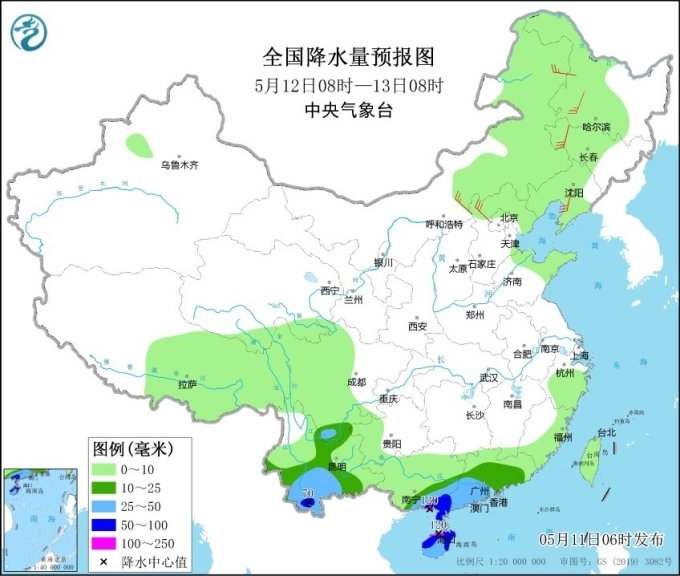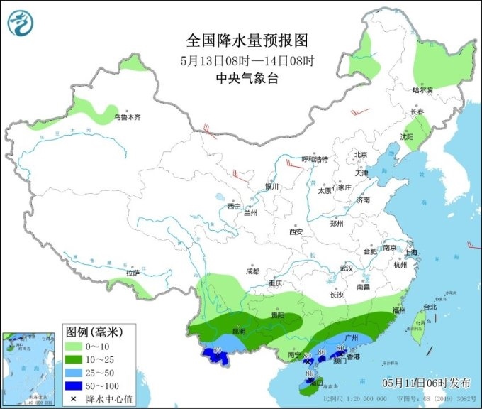 預(yù)計未來三天(11日至13日),華南地區(qū)仍有較強(qiáng)降雨,廣西、廣東、海南島等地大部地區(qū)日雨量有中到大雨,局地暴雨或大暴雨;此外,云南中南部有中到大雨,局地暴雨。