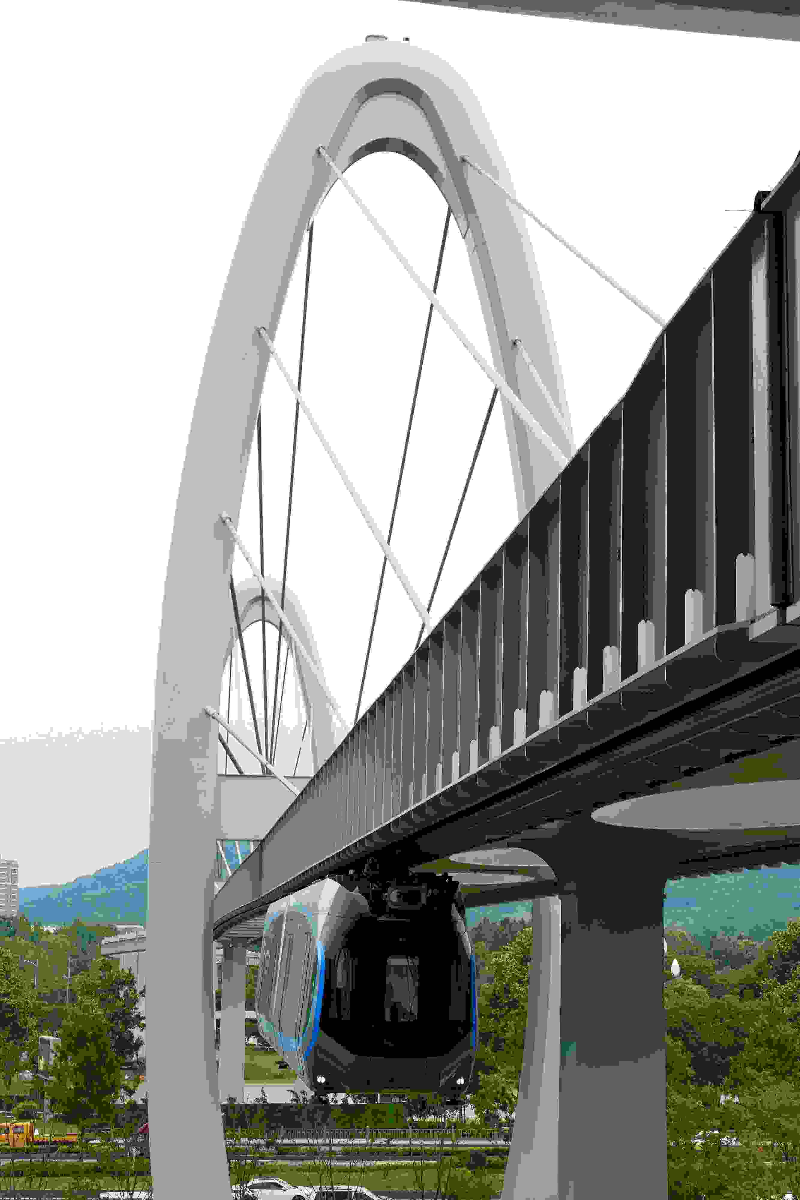 2023年5月11日,武漢,光谷空軌旅游線項目“光谷光子號”空中軌道列車在東湖高新區(qū)試跑。武漢光谷空軌旅游線項目位于武漢市東湖高新區(qū)光谷中央生態(tài)大走廊內(nèi),是生態(tài)大走廊旅游配套基礎(chǔ)設(shè)施之一。其規(guī)劃總長26.7公里,先行建設(shè)的一期工程長約10.5公里,設(shè)車站6座。 視覺中國