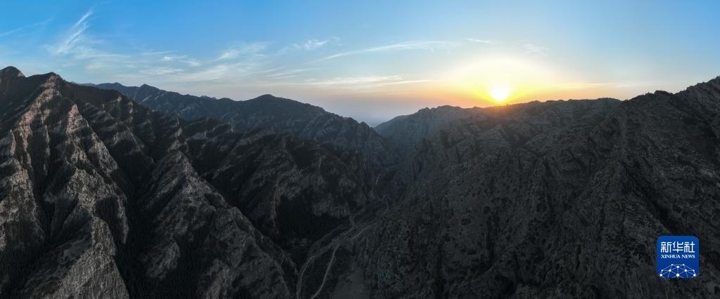 日落時(shí)分的內(nèi)蒙古賀蘭山國(guó)家級(jí)自然保護(hù)區(qū)(5月11日攝,無人機(jī)全景照片)。