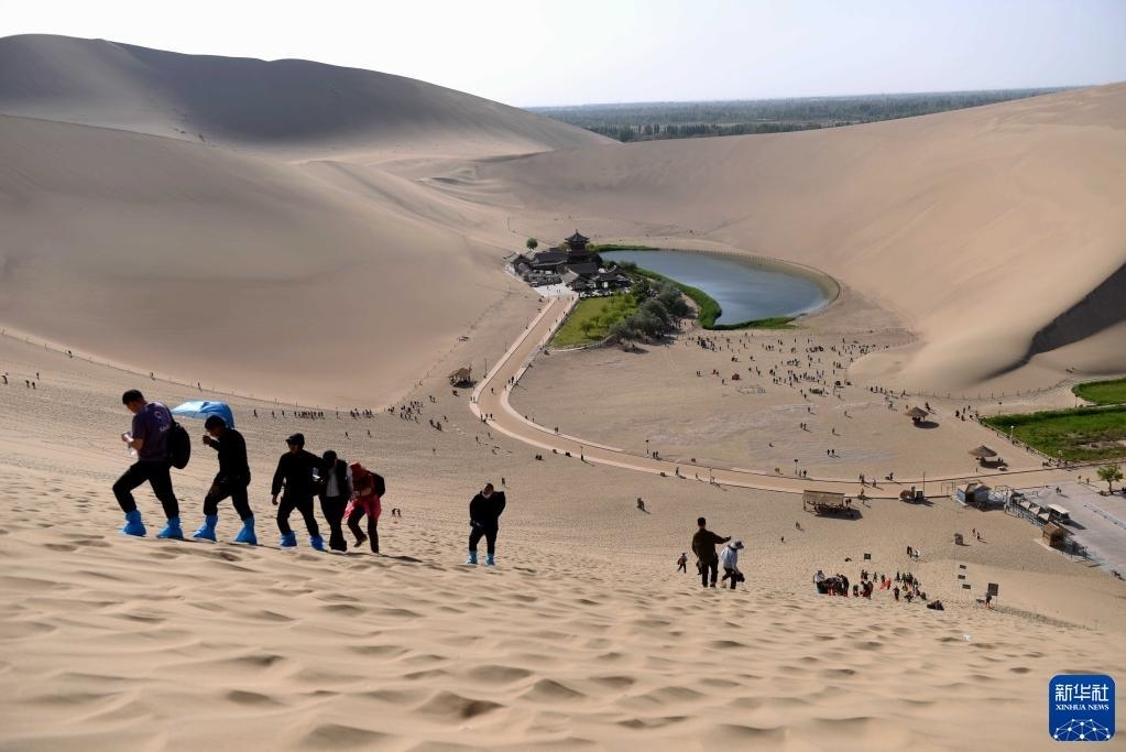 5月11日,游客在鳴沙山月牙泉景區(qū)爬沙山。
