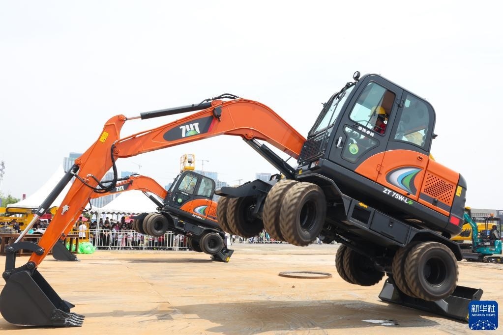 5月13日,在長(zhǎng)沙國(guó)際工程機(jī)械展覽會(huì)上,機(jī)手駕駛輪式挖掘機(jī)表演。