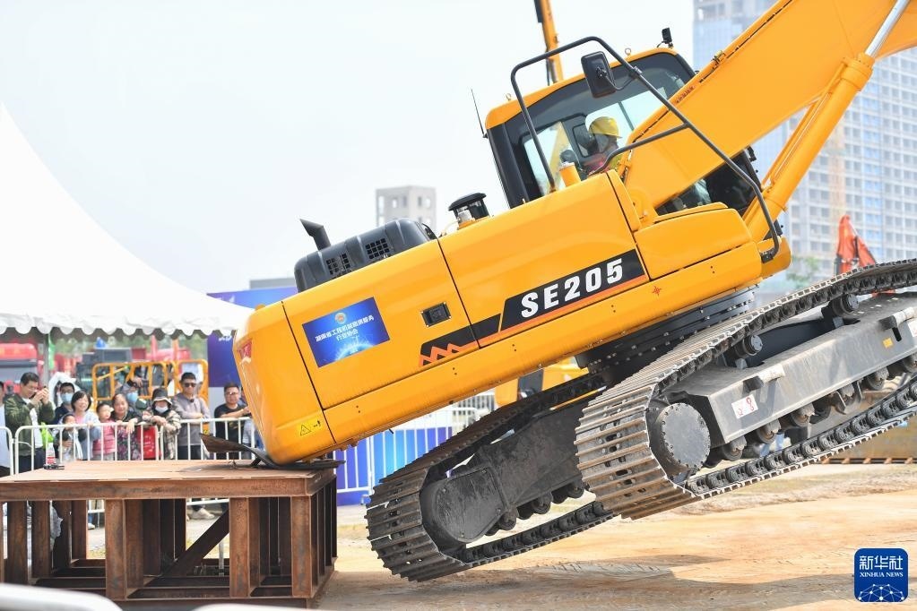 5月13日,在長(zhǎng)沙國(guó)際工程機(jī)械展覽會(huì)上,機(jī)手駕駛挖掘機(jī)表演。