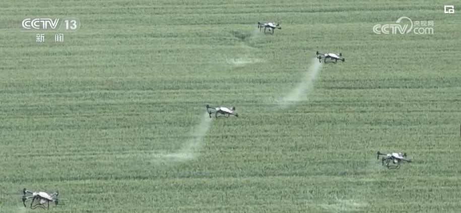 在運(yùn)城河津市的小麥地里,10架無人機(jī)正在麥田上方進(jìn)行噴灑作業(yè)。