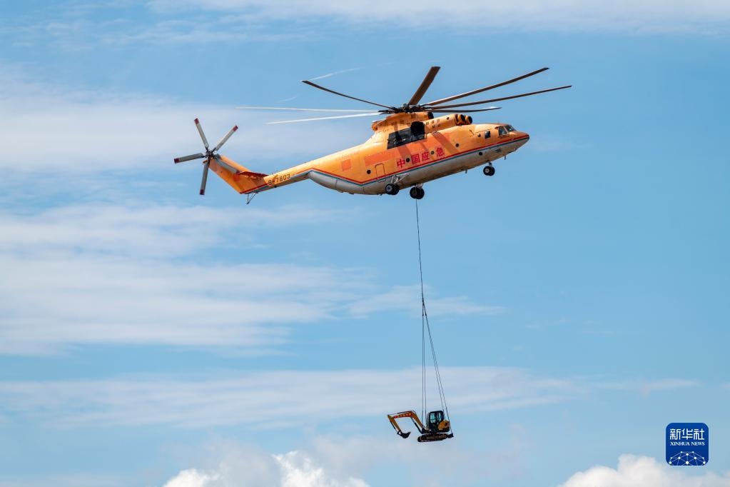 5月16日,一架參演直升機(jī)在麗江演習(xí)現(xiàn)場(chǎng)上空轉(zhuǎn)運(yùn)一臺(tái)挖掘機(jī)。