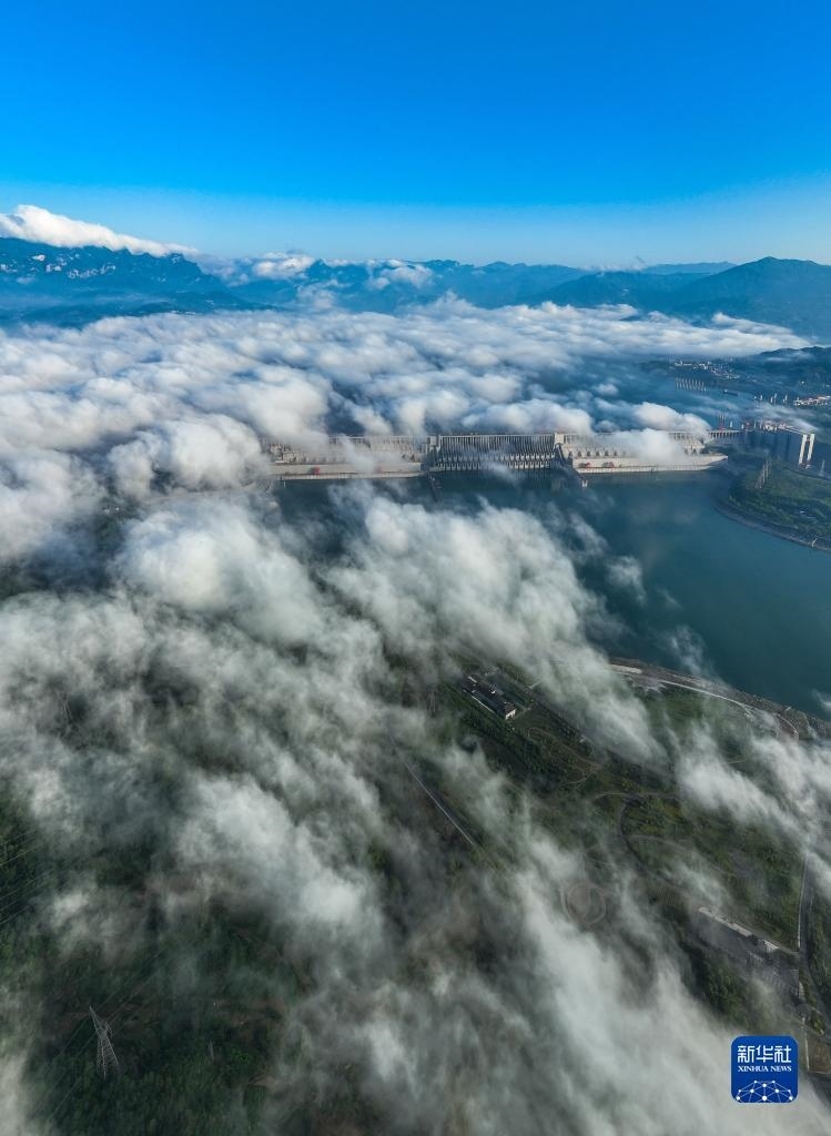 當日,湖北宜昌雨過天晴,三峽上空云霧繚繞,美景如畫。